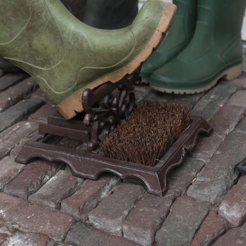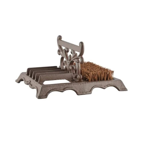 Grattoir à chaussures en fonte avec brosse en fibre de coco – Esschert designSuper accessoire, au design rustique, pour rendre vos chaussures et vos bottes impeccables ! Grâce à ce grattoir en fonte et sa brosse en fibre de coco, votre maison reste propre ! Deux cotés : racloir et grattoir pour décrotter et brosse pour gratter l’intérieur des crampons et semelles. Caractéristiques techniques :Hauteur : 14 cm. Largeur : 27 cm. Largeur : 21 cm. Matière : fonte.