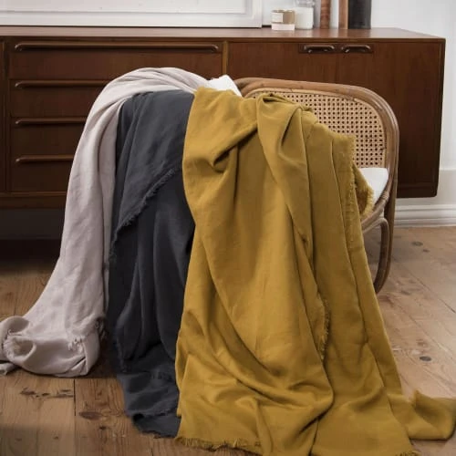 Matière naturelle et authentique, le lin lavé est élégant et délicat, pour une chambre au caractère naturel et épuré. Facile à vivre et à s’approprier, notre collection LENA se distingue surtout par son toucher aérien et vaporeux, à la fois raffinée et décontractée. Notre lin est légèrement froissé lavé pour plus de douceur et prélavé pour éviter qu’il ne rétrécisse, ne perde sa forme ou ne se décolore après l’achat. Il s’assouplit et s’embellit au fil du temps et des lavages. Cette fibre qui respire et n’est jamais froide en hiver ou chaude en été agi comme un thermostat naturel contribuant à la qualité de votre sommeil. Au-delà du confort qu’il procure le lin a également des vertus antiallergiques et antibactériennes. Le traitement respectueux de cette fibre ainsi que nos teintures exclusives préservent ses qualités. Produit certifié Oeko-Tex® : Le label Oeko-Tex® garantit que les articles testés et certifiés ne présentent pas de substances pouvant nuire à la santé. Nos draps sont très résistants mais nous recommandons tout de même un lavage à 40 degrés pour préserver les fibres (et la planète). Préférez le séchage à l’air libre au sèche-linge. Si vous utilisez ce dernier, optez pour une température modérée et retirez vos draps avant séchage complet. Conscients de l’environnement nous avons pour toutes nos productions à partir de 2020 changé nos emballages. Nos jolis pochons de rangement cousus dans le même tissu et la couleur de votre produit remplacent maintenant le plastique et le carton. Nous conseillons de laver vos produits à froid avant toute première utilisation. Dimensions disponibles du plaid en lin lavé LENA : • 180 x 260 cm 100% Lin – Produit fabriqué en Inde