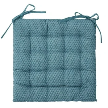 . . Cette galette de chaise impriméeà petits motifs etmatelassée en 16 pointsvous apporteraun. confort optimal. Ses motifs géométriques habilleront avec élégance votre assise. Pour installer facilement cet accessoire, il suffit de nouer les liens au dossier de la chaise. Lavage à la main. . Caractéristiques:. Dimensions :38 x 38 cm. Finition :par nouettes. Composition :100% coton. Coloris :gris, lin, ocre, terracotta, kaki et canard. Vendue à l’unité. .