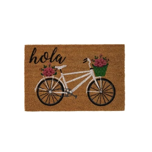 Paillasson en coco multicolore avec dessin d’un vélo fleuri.